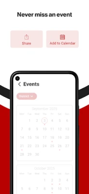 NEVER MISS AN EVENT The event section shows a list of events throughout the district. Users can add an event to their calendar to share the event with friends and family with one tap.
