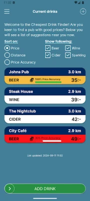 Discover the best pubs and drink prices nearby with our innovative app! Whether you're new in town or just looking for a new favorite pub, our app helps you find the perfect spot to enjoy a drink.