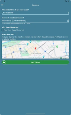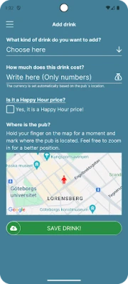 - Find nearby pubs: Using your GPS, the app quickly and easily shows pubs in your vicinity. - View current drink prices: Get an overview of drink prices at different pubs, so you always know where to get the best deals. - Rate drink prices: The user rating system helps you see how reliable the listed prices are. - Add your own drinks: Missing a drink from the list? No problem! Easily add new drinks and help other users get a complete overview. - User-friendly interface: An intuitive and easy-to-use design that makes your experience smooth and simple.