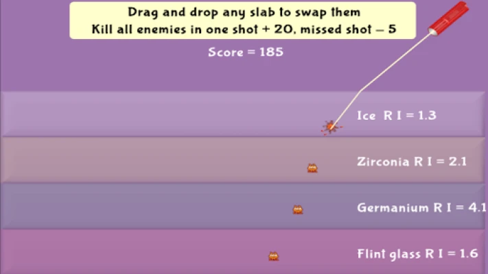 Drag and swap slabs of different materials having different refractive index to kill all enemies in one shot.